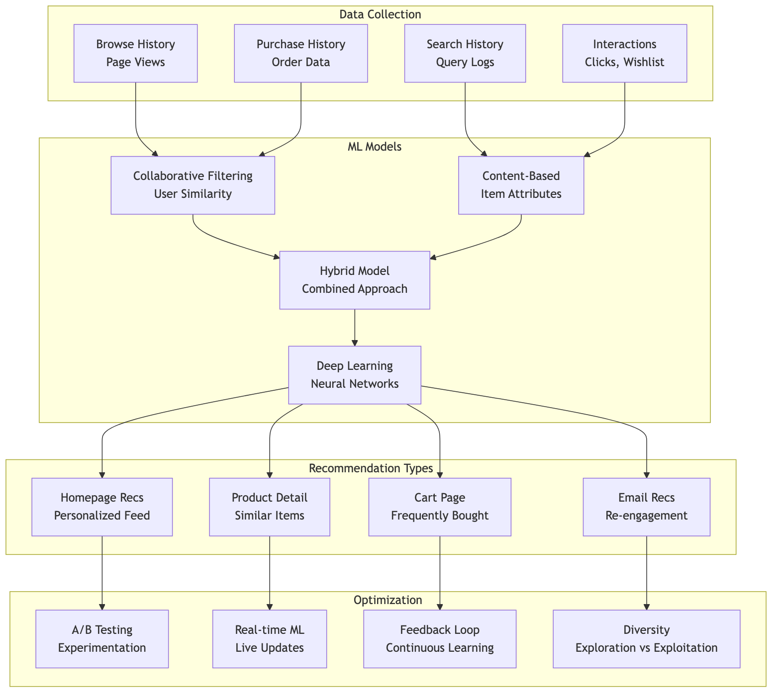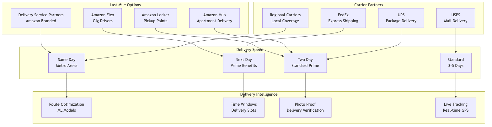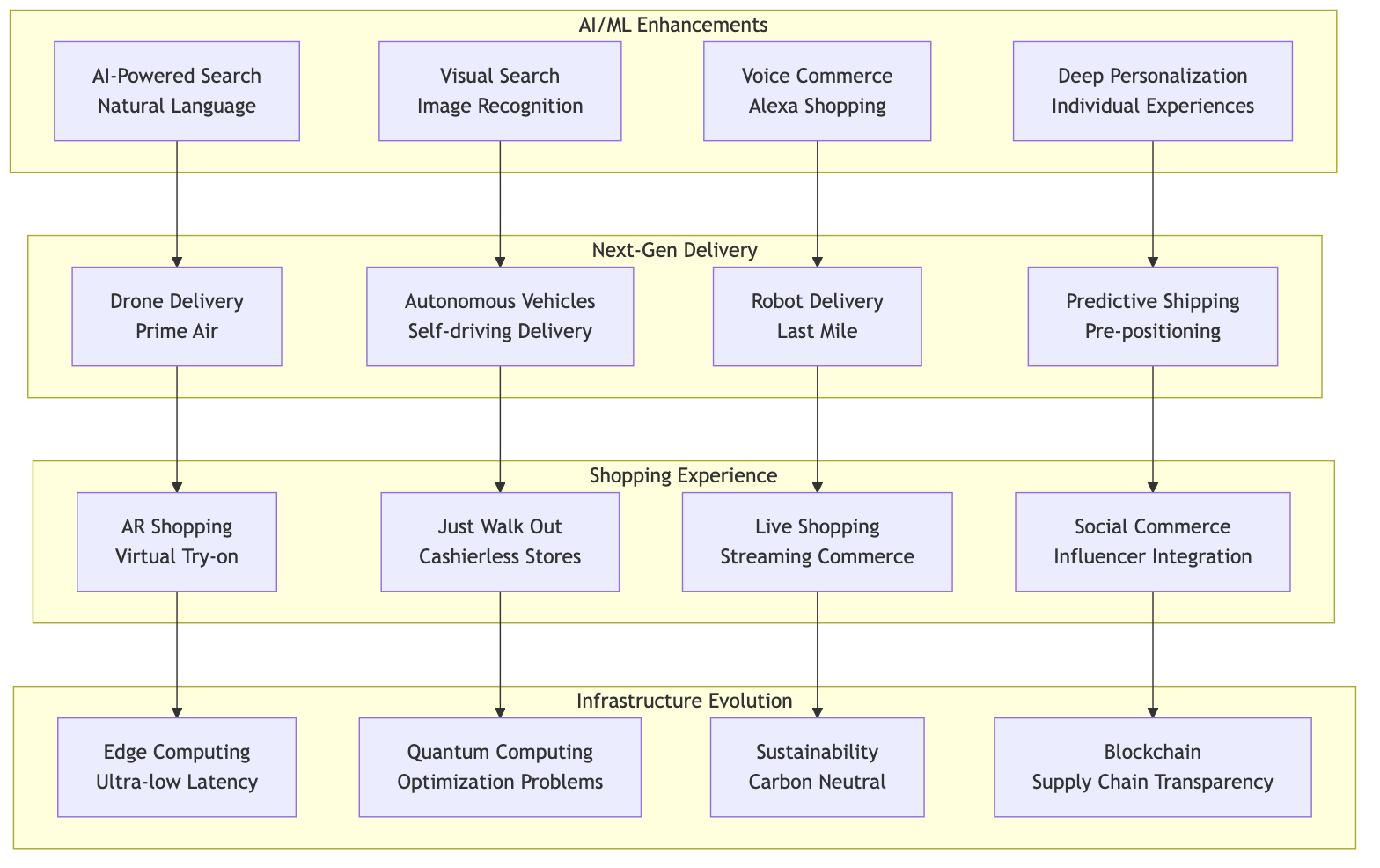 The architecture continues to evolve with emerging technologies like AI-powered search, drone delivery, and augmented reality shopping experiences, maintaining Amazon's position as the leader in e-commerce innovation.
