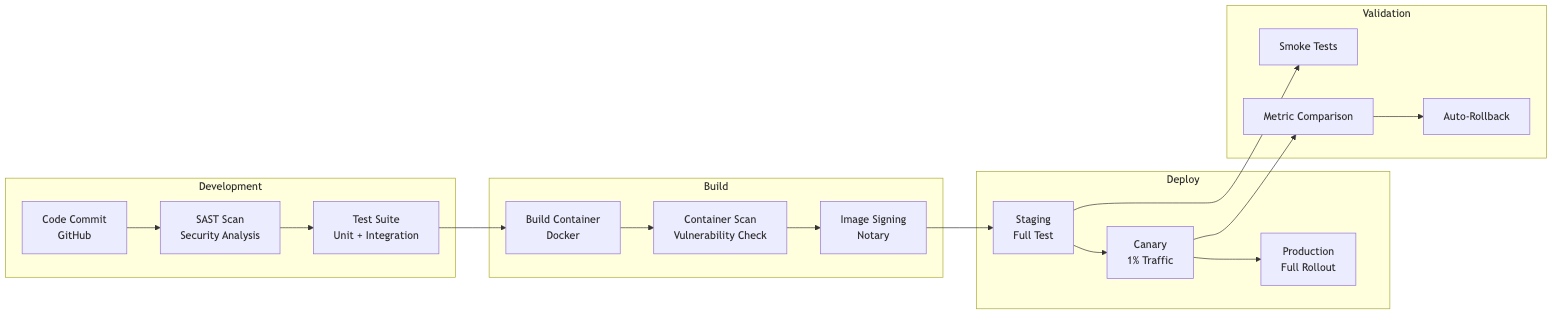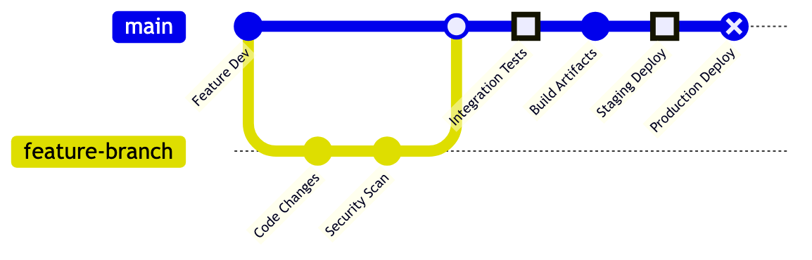 main feature-branch Feature Dev Code Changes Security Scan Integration Tests Build Artifacts Staging Deploy Production Deploy main feature-branch Feature Dev Code Changes Security Scan Integration Tests Build Artifacts Staging Deploy Production Deploy