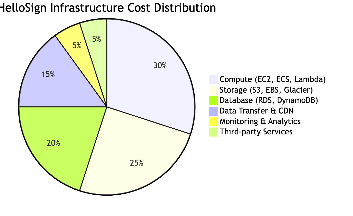30% 25% 20% 15% 5% 5% HelloSign Infrastructure Cost Distribution Compute (EC2, ECS, Lambda) Storage (S3, EBS, Glacier) Database (RDS, DynamoDB) Data Transfer & CDN Monitoring & Analytics Third-party Services 30% 25% 20% 15% 5% 5% HelloSign Infrastructure Cost Distribution Compute (EC2, ECS, Lambda) Storage (S3, EBS, Glacier) Database (RDS, DynamoDB) Data Transfer & CDN Monitoring & Analytics Third-party Services