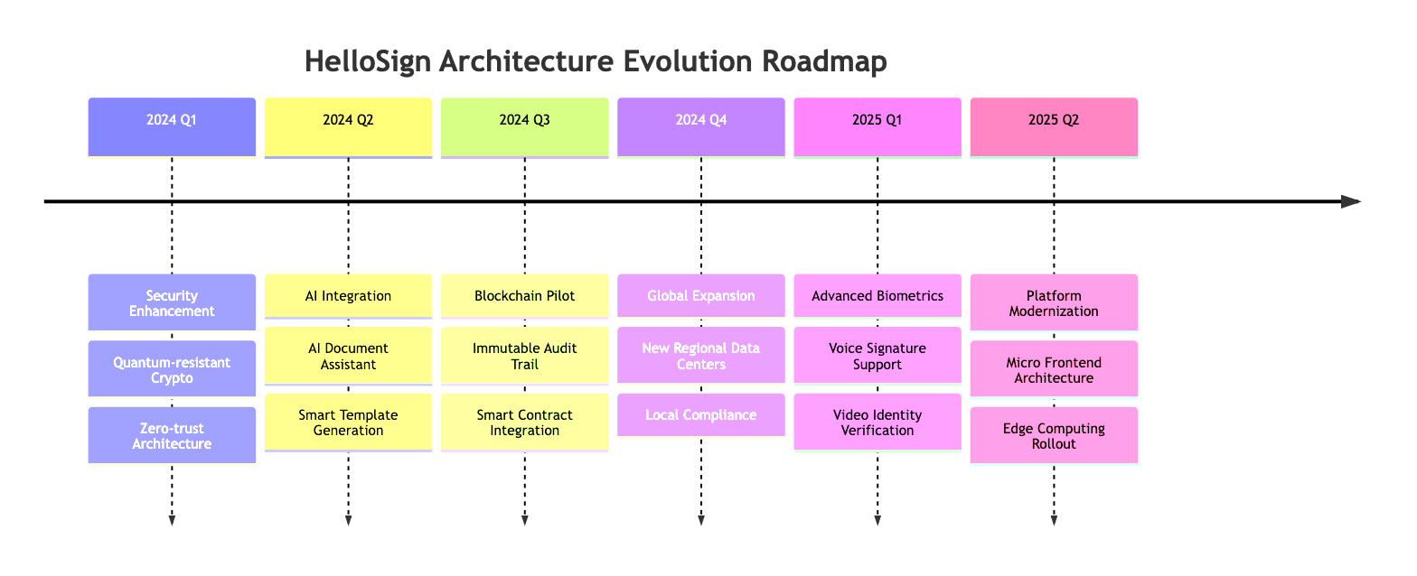 2024 Q1 Security Enhancement Quantum-resistant Crypto Zero-trust Architecture 2024 Q2 AI Integration AI Document Assistant Smart Template Generation 2024 Q3 Blockchain Pilot Immutable Audit Trail Smart Contract Integration 2024 Q4 Global Expansion New Regional Data Centers Local Compliance 2025 Q1 Advanced Biometrics Voice Signature Support Video Identity Verification 2025 Q2 Platform Modernization Micro Frontend Architecture Edge Computing Rollout HelloSign Architecture Evolution Roadmap 2024 Q1 Security Enhancement Quantum-resistant Crypto Zero-trust Architecture 2024 Q2 AI Integration AI Document Assistant Smart Template Generation 2024 Q3 Blockchain Pilot Immutable Audit Trail Smart Contract Integration 2024 Q4 Global Expansion New Regional Data Centers Local Compliance 2025 Q1 Advanced Biometrics Voice Signature Support Video Identity Verification 2025 Q2 Platform Modernization Micro Frontend Architecture Edge Computing Rollout HelloSign Architecture Evolution Roadmap