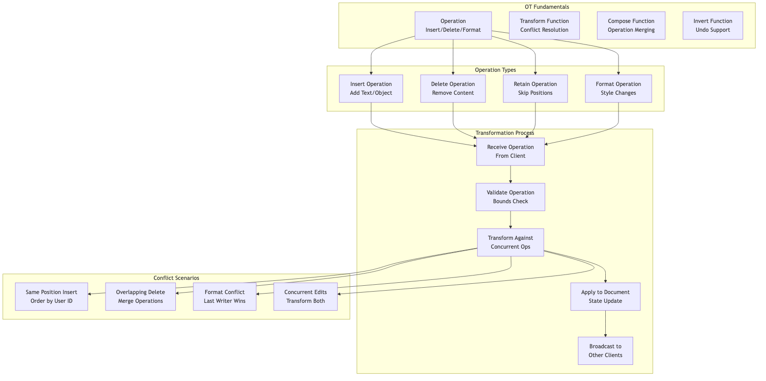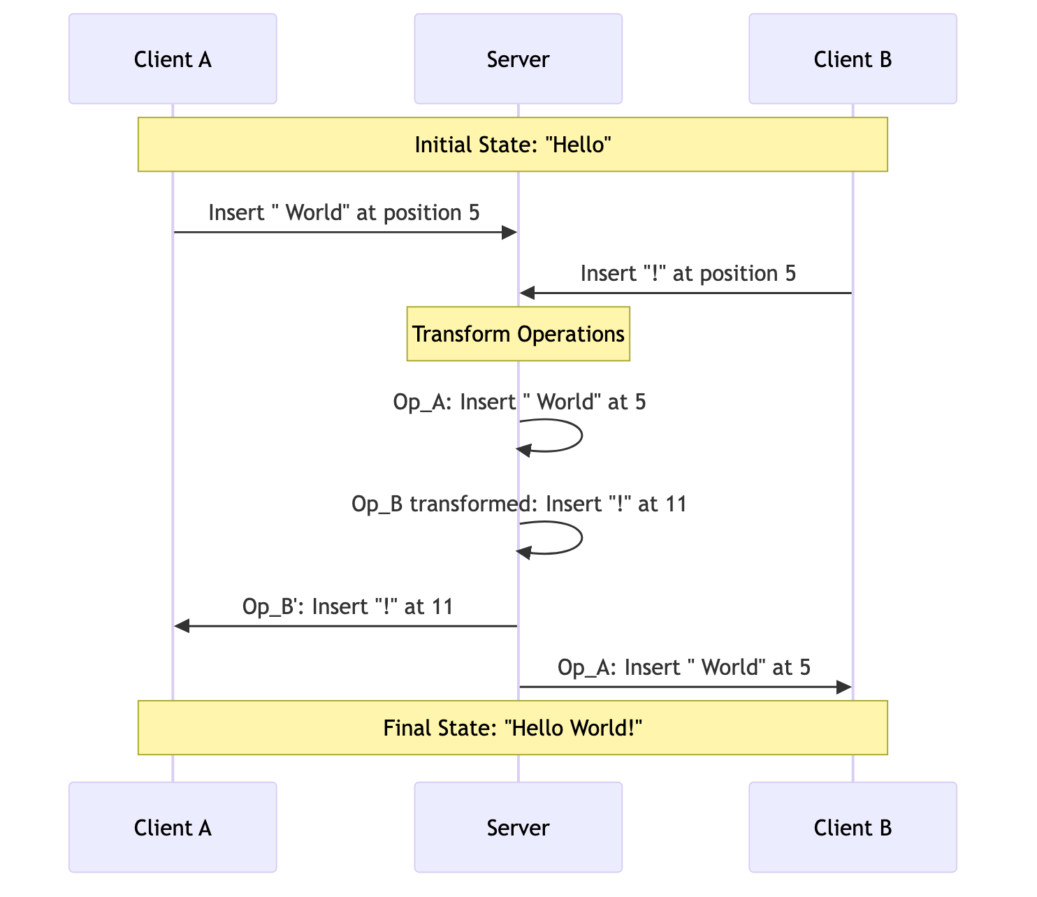Client B Server Client A Client B Server Client A Initial State: "Hello" Transform Operations Final State: "Hello World!" Insert " World" at position 5 Insert "!" at position 5 Op_A: Insert " World" at 5 Op_B transformed: Insert "!" at 11 Op_B': Insert "!" at 11 Op_A: Insert " World" at 5 Client B Server Client A Client B Server Client A Initial State: "Hello" Transform Operations Final State: "Hello World!" Insert " World" at position 5 Insert "!" at position 5 Op_A: Insert " World" at 5 Op_B transformed: Insert "!" at 11 Op_B': Insert "!" at 11 Op_A: Insert " World" at 5
