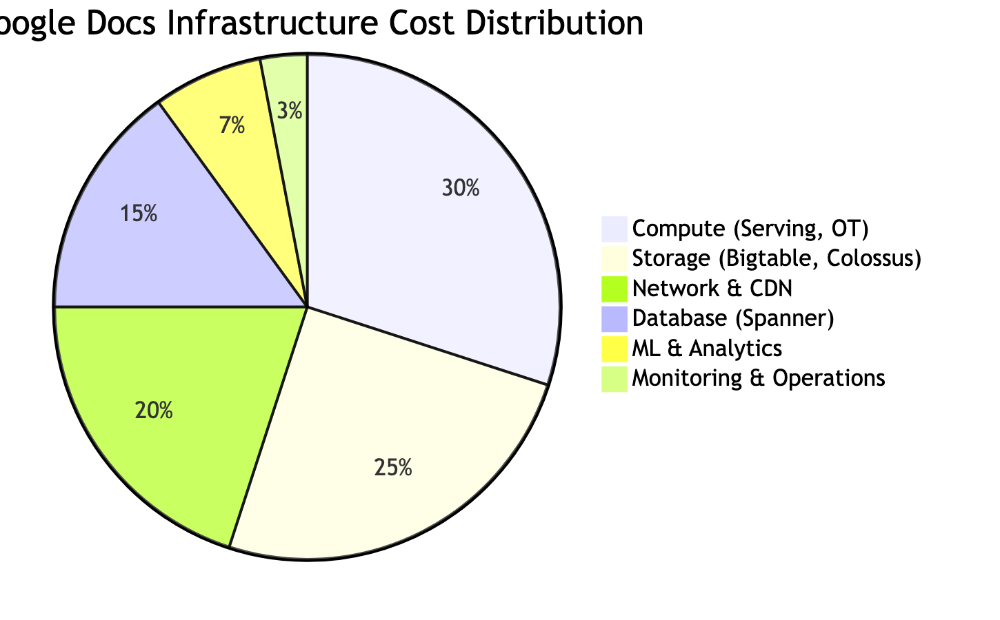 30% 25% 20% 15% 7% 3% Google Docs Infrastructure Cost Distribution Compute (Serving, OT) Storage (Bigtable, Colossus) Network & CDN Database (Spanner) ML & Analytics Monitoring & Operations 30% 25% 20% 15% 7% 3% Google Docs Infrastructure Cost Distribution Compute (Serving, OT) Storage (Bigtable, Colossus) Network & CDN Database (Spanner) ML & Analytics Monitoring & Operations