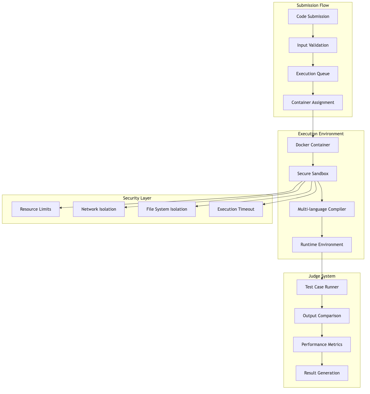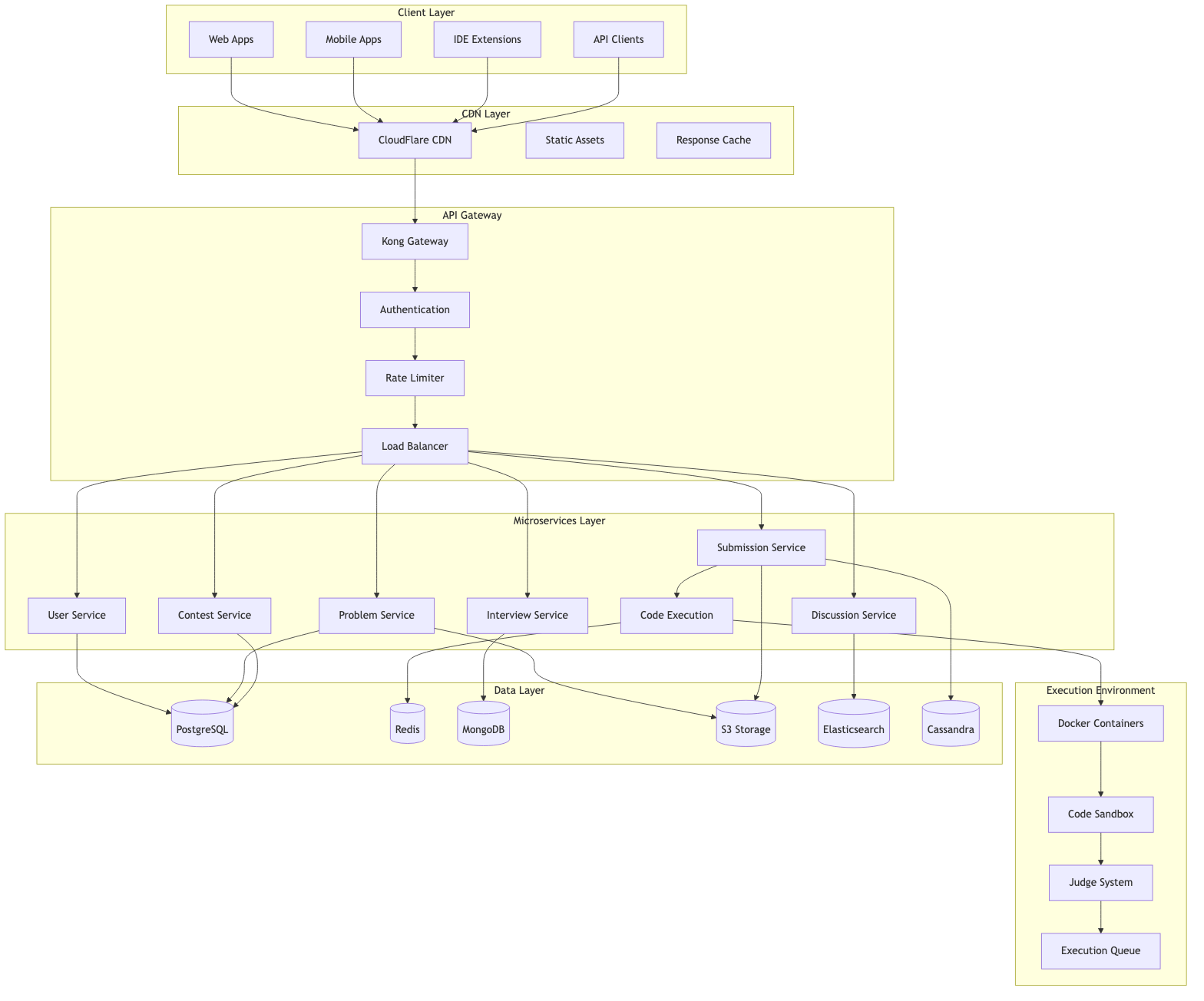 LeetCode's architecture represents a sophisticated distributed system designed to handle the unique challenges of online coding platforms. The system successfully manages: