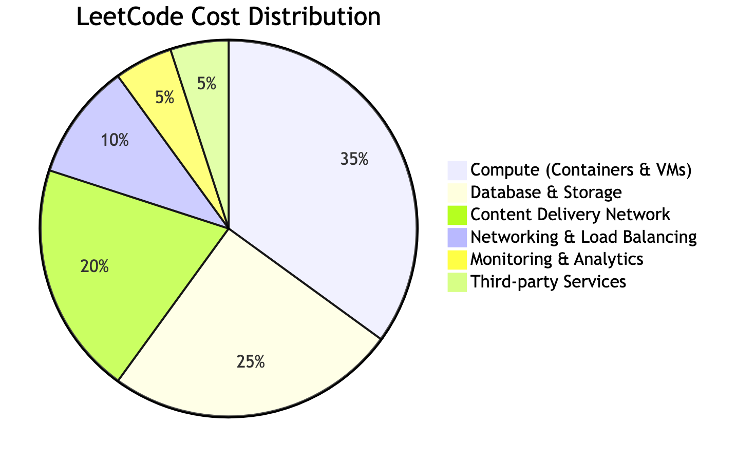 35% 25% 20% 10% 5% 5% LeetCode Cost Distribution Compute (Containers & VMs) Database & Storage Content Delivery Network Networking & Load Balancing Monitoring & Analytics Third-party Services 35% 25% 20% 10% 5% 5% LeetCode Cost Distribution Compute (Containers & VMs) Database & Storage Content Delivery Network Networking & Load Balancing Monitoring & Analytics Third-party Services