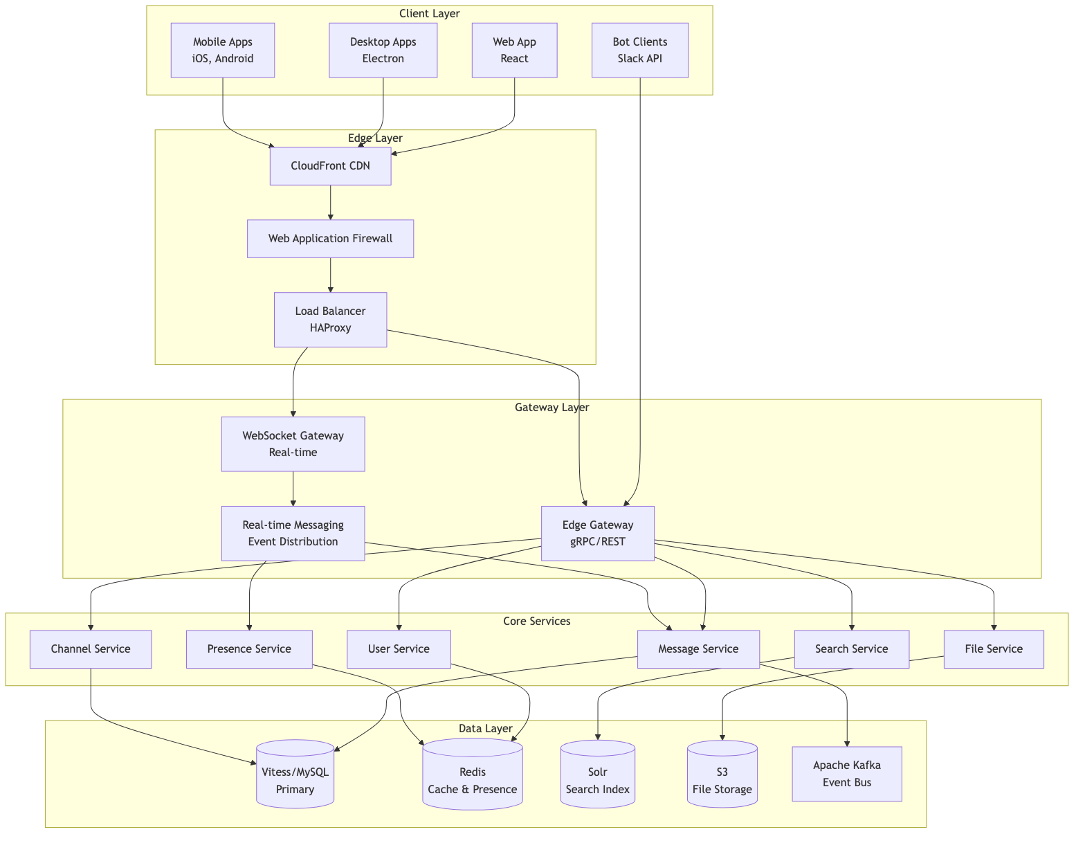 Slack's architecture demonstrates how to build a real-time collaboration platform at scale. The combination of WebSocket-based real-time messaging, Vitess-powered database sharding, and efficient presence tracking enables Slack to deliver reliable communication for millions of teams.