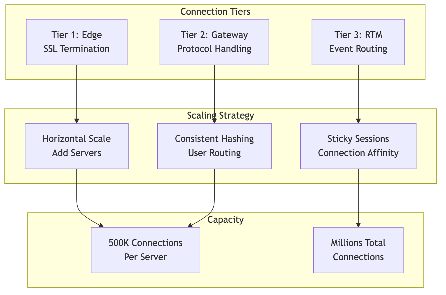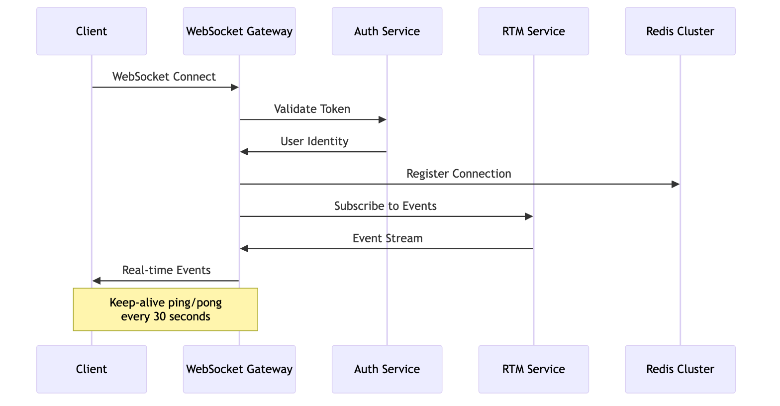 Redis Cluster RTM Service Auth Service WebSocket Gateway Client Redis Cluster RTM Service Auth Service WebSocket Gateway Client Keep-alive ping/pong every 30 seconds WebSocket Connect Validate Token User Identity Register Connection Subscribe to Events Event Stream Real-time Events Redis Cluster RTM Service Auth Service WebSocket Gateway Client Redis Cluster RTM Service Auth Service WebSocket Gateway Client Keep-alive ping/pong every 30 seconds WebSocket Connect Validate Token User Identity Register Connection Subscribe to Events Event Stream Real-time Events