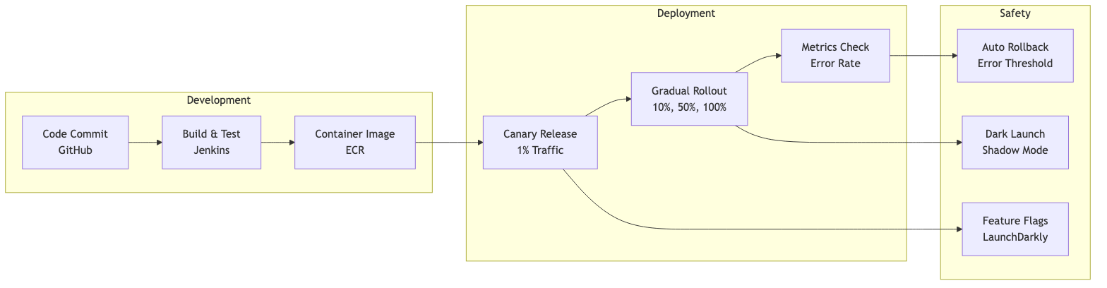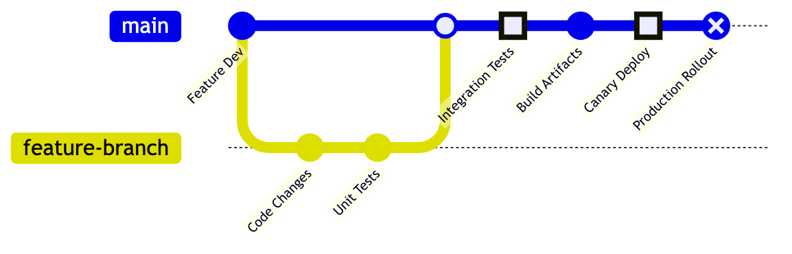 main feature-branch Feature Dev Code Changes Unit Tests Integration Tests Build Artifacts Canary Deploy Production Rollout main feature-branch Feature Dev Code Changes Unit Tests Integration Tests Build Artifacts Canary Deploy Production Rollout