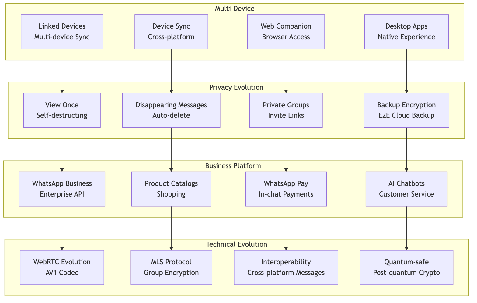 The platform continues to evolve with features like multi-device support, disappearing messages, and business messaging, while maintaining the core principles of security, privacy, and simplicity.